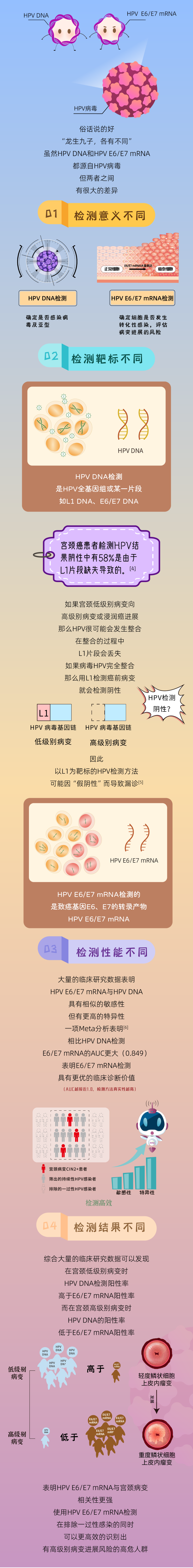 由此我们可以看出,HPV DNA和HPV E6/E7 mRNA虽然都属于HPV核酸检测,但是却是两种不同的检测方法。在宫颈癌筛查中,HPV检测的目的是要检出癌前病变和宫颈癌,同时捕获出未来可能罹患宫颈癌的风险人群,而非检测出病毒本身。HPV DNA检测虽然敏感性很高,但是特异性不足,HPV阳性可能仅处于HPV感染阶段,不代表已有癌前病变,容易造成被筛查者的心理负担、过度诊断和过度治疗。HPV E6/E7 mRNA检测阳性,代表患者有疾病进展的风险,特异性更高,更能满足临床上早发现、早诊断和早治疗子宫颈癌前病变及早期子宫颈癌的筛查目的。