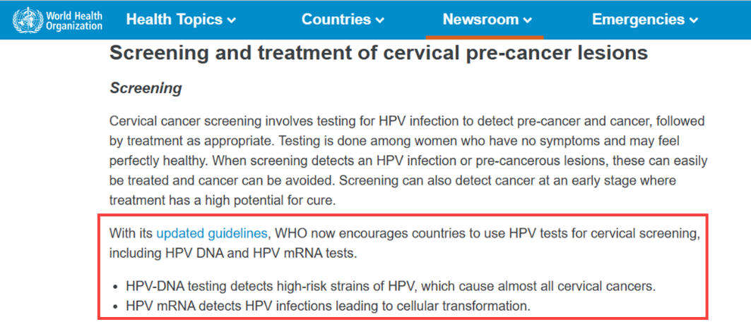 “世卫组织更新了指南,鼓励各国使用HPV检测进行宫颈筛查。包括HPV DNA和HPV mRNA检测。