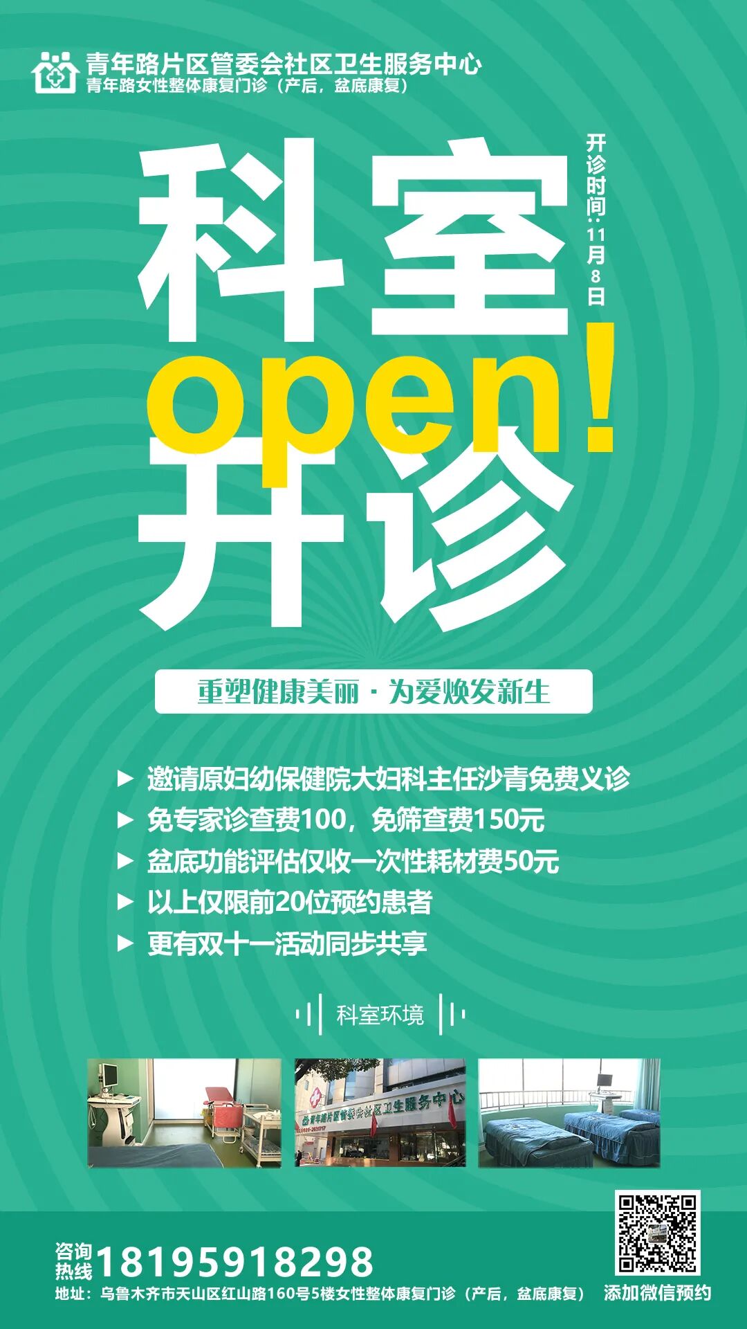 值得一提的是,青年路社区卫生服务中心产后康复科正处开诊活动,期间上述双十一优惠可与开诊优惠叠加!