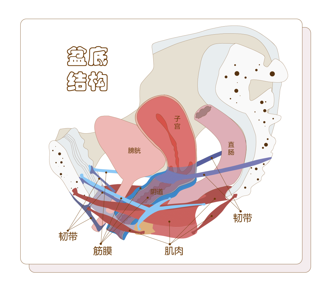 盆底结构除了我们熟知的盆底肌之外,还有韧带、筋膜等结缔组织,这就像是家里顶灯挂在天花板上,而操控它的线藏在墙里,我们看不见一样。