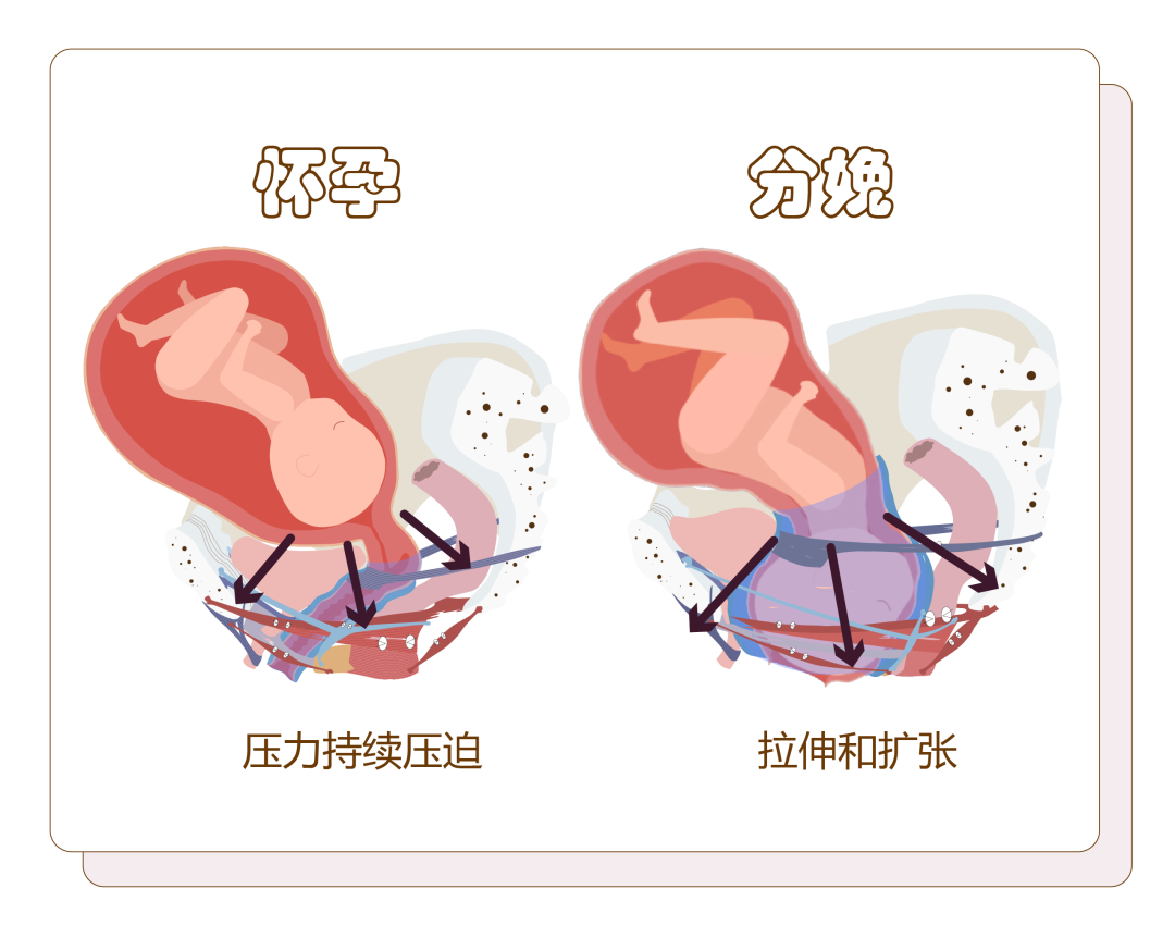 怀孕期间,为了让子宫等器官维持正常位置,盆底会紧紧闭合。但在这个过程中,随着孕周的增加,宝宝和羊水会持续压迫盆底,盆底受到的压力也会逐渐增大,到了一定程度,这种压力就会引起筋膜和韧带的损伤。
